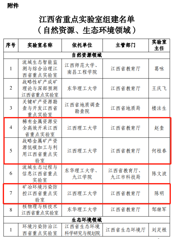 申报的战略金属矿产资源低碳加工与利用江西省重点实验室、矿冶环境污染防控江西省重点实验室、河流源头水生态保护江西省重点实验室、稀有金属资源安全高效开采江西省重点实验室获批组建。
