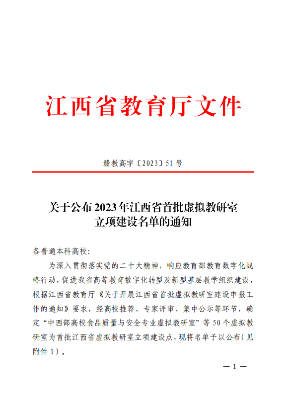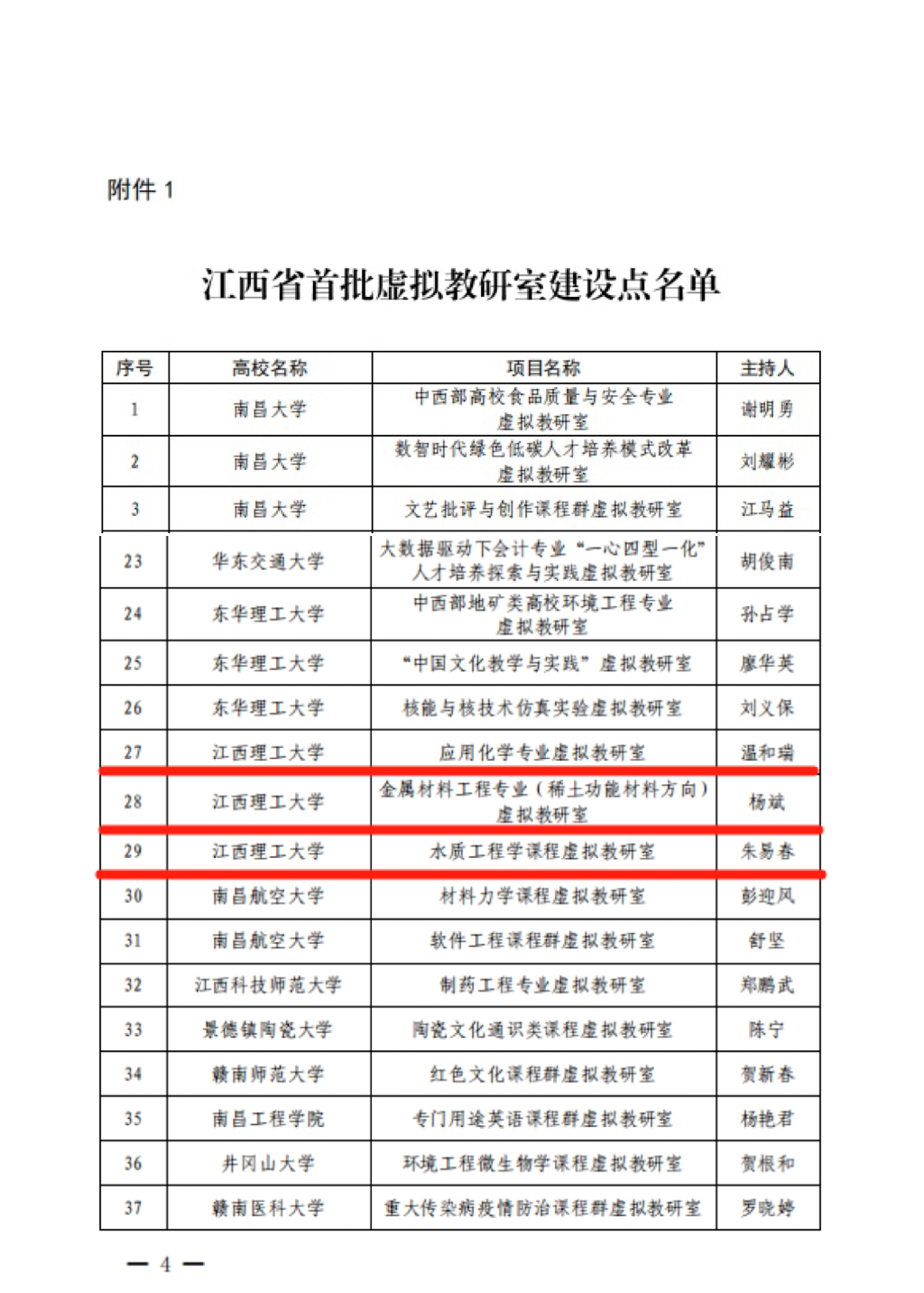 本网讯 近日,江西省教育厅下发了《关于公布2023年江西省首批虚拟教研室立项建设名单的通知》(赣教高字〔2023〕51 号),木瓜视频 申报的应用化学专业虚拟教研室、金属材料工程专业(稀土功能材料方向)虚拟教研室、水质工程学课程虚拟教研室获批确立为首批江西省虚拟教研室立项建设点。