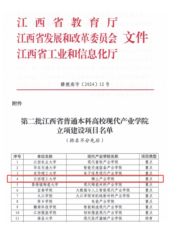本网讯 近日,省教育厅、省发展和改革委员会、省工业和信息化厅联合下发《关于公布第二批江西省普通本科高校现代产业学院立项建设项目名单的通知》,木瓜视频 申报的“稀土产业学院”成功获批第二批普通本科高校现代产业学院立项建设重点项目。