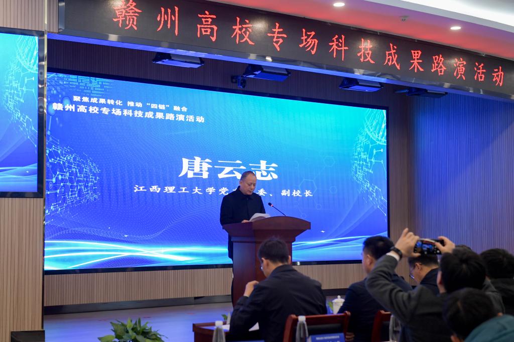 副校长唐云志在致辞中表示,为了架起科技成果产业化“铁索桥”,学校提出了“服务国家战略需求、服务区域和行业发展”的办学使命、“以贡献求支持、以特色争优势、以创新谋发展”的办学思路和“建设综合实力全国一流、行业引领作用突显、特色领域国际领先的高水平大学”的办学目标,加强与稀土、铜、钨、锂电、钢铁等领域头部企业合作,提高科技成果成熟度,建立专业的成果转化机构和人才队伍,完善转化机制和收益分配机制,争取政府资金和创业基金支持,探索出跨越科技成果转化“死亡谷”的“七个一”江理新模式。