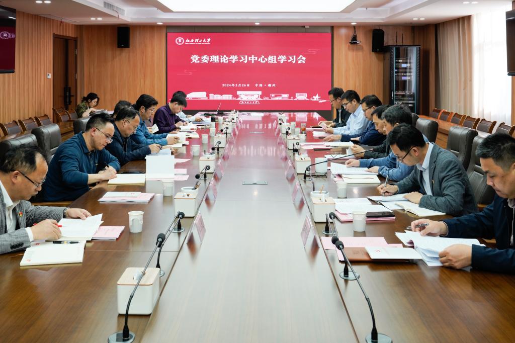 在三江校区濂溪楼2号会议室召开党委理论学习中心组学习会。全体在家校领导、党委常委、学校党委理论学习中心组全体成员参加会议。会议由校党委书记杨斌主持。