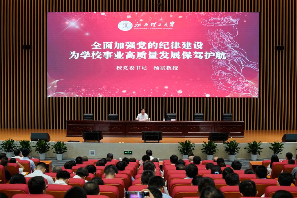 “七一”表彰大会暨校党委书记讲纪律党课在三江校区志远会议中心举行。校党委书记杨斌以“全面加强党的纪律建设,为学校事业高质量发展保驾护航”为题为学校师生党员干部代表讲党课。