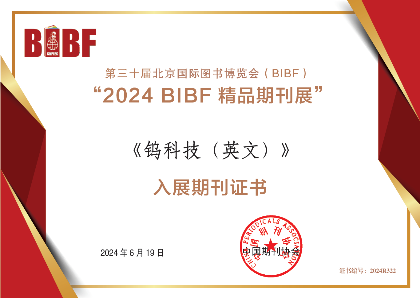 主办的《钨科技(英文)》以“迎接新中国成立75周年”为参展主题进行首次申报,并成功入选此届博览会“2024BIBF精品期刊展”进行展出。