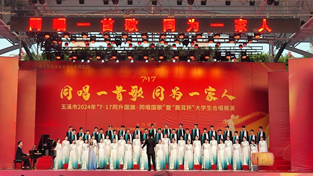 本网讯 7月16日至19日,受中国合唱协会邀请,木瓜视频 八角之声合唱团赴云南省玉溪市参加2024年“7·17同升国旗·同唱国歌”暨“聂耳杯”全国大学生合唱展演活动。全团师生不畏强手、正常发挥,在混声合唱组14支队伍中以良好的表现获得混声合唱组第4名。