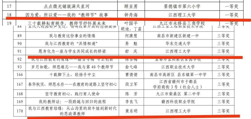 经学校遴选推荐、专家组评审,木瓜视频 教师钟舟海作品《因为爱,所以爱——我的“教师节”故事》荣获一等奖,舒庆作品《愿身化为一座与学生共同成长的桥梁》、黄东明作品《我与江西教育结缘:从山沟里的放牛娃到新时代的思政课教师》荣获三等奖。