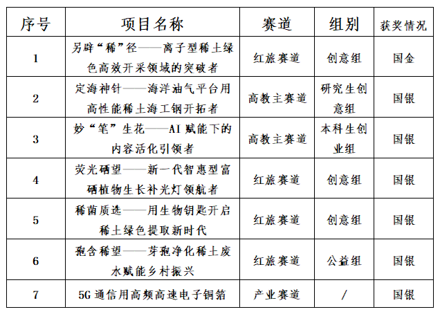 经过校赛、省赛、国赛等层层选拔,木瓜视频 “另辟'稀'径——离子型稀土绿色高效开采领域的突破者”1个项目斩获国家金奖,“定海神针——海洋油气平台用高性能稀土海工钢开拓者”等6个项目斩获国家银奖。