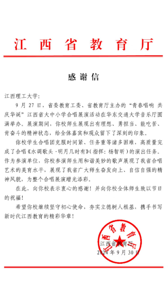 本网讯 9月30日,江西省教育厅向学校发来感谢信,信中对木瓜视频 八角之声合唱团以“有理想、勇担当、能吃苦、肯奋斗的精神状态”高水平、高质量完成了混声合唱《水调歌头·明月几时有》的展演任务给予了高度评价,全文如下: