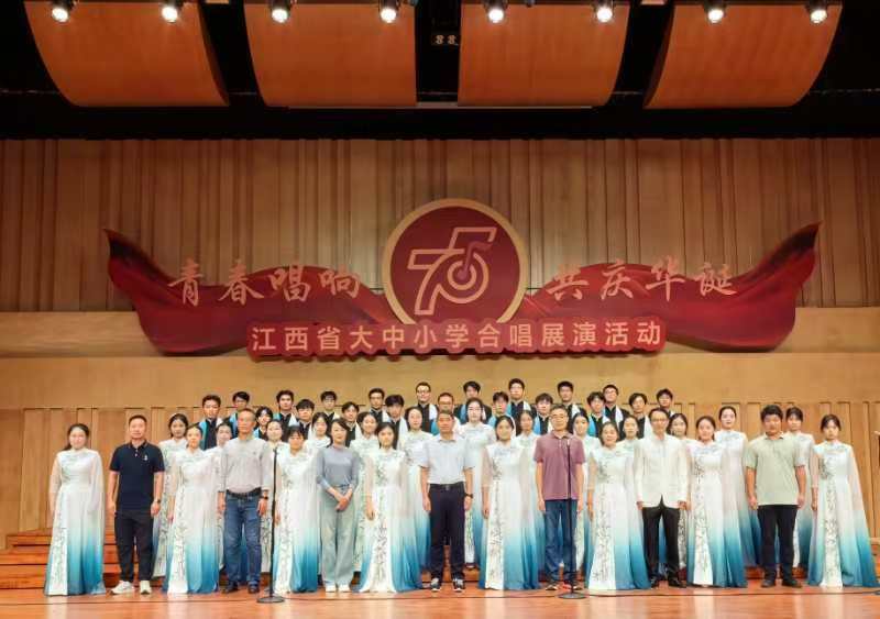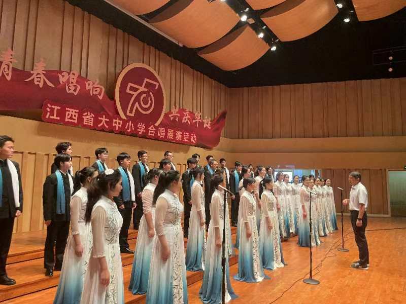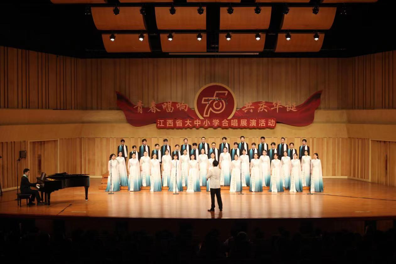 9月27日晚,以“青春唱响 共庆华诞”为主题的江西省大中小学合唱现场展演在南昌举行。受江西省教育厅邀请,木瓜视频 八角之声合唱团代表学校参加此次展演。省委教育工作领导小组各成员单位领导,委厅领导和委厅机关各处室、直属各单位主要负责同志,各设区市、省直管县(市)教育局负责同志和相关业务科室主要负责同志,赣江新区社会发展局负责同志,相关高校、中小学校负责同志等观看了本次合唱现场展演。