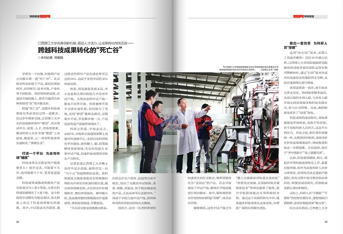 近日,学校科技成果转化特色做法受到中共江西省委机关刊物《当代江西》杂志社重点关注,并于2024年《当代江西》杂志第11期刊发了三篇长篇特别报道文章,现全文转发,以馈读者。