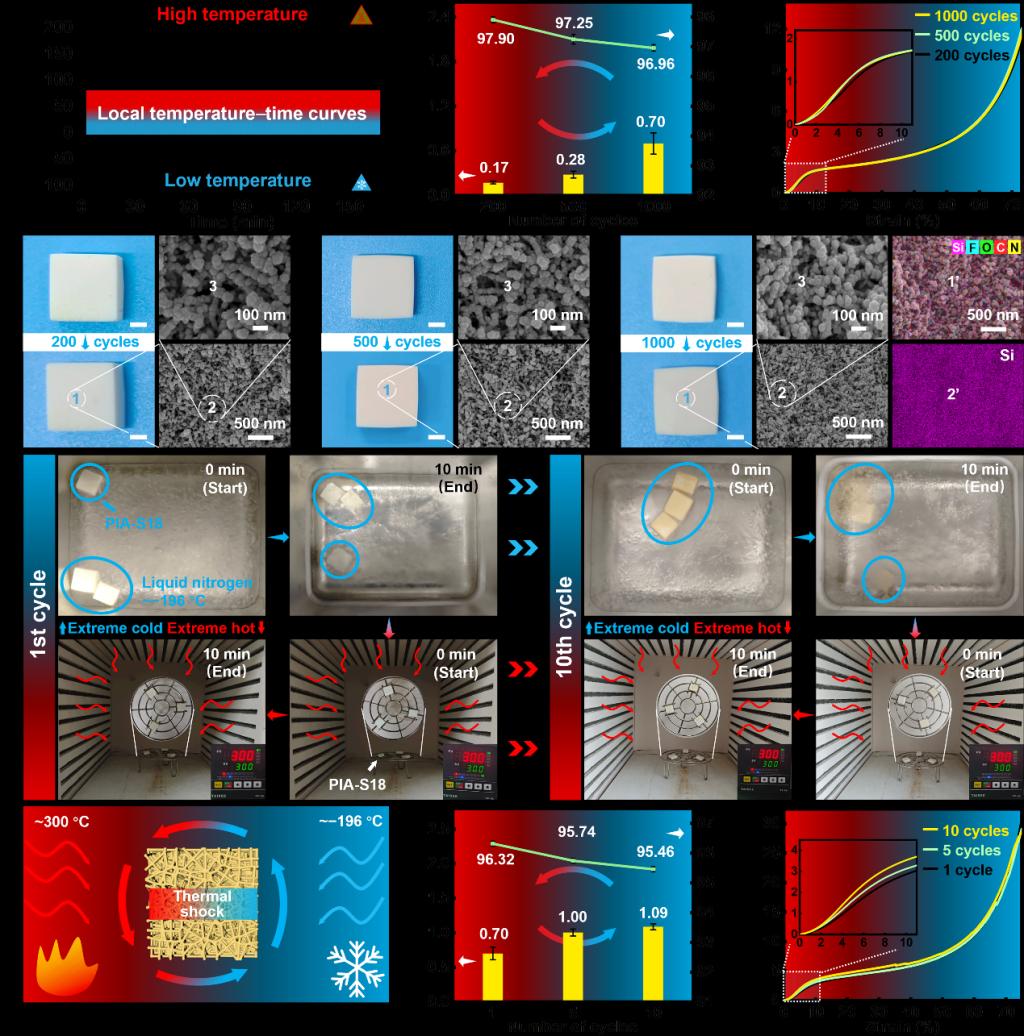 本研究还设计了两组热冲击循环实验,在高低温交变循环条件下(温差为270 ℃),所制聚酰亚胺气凝胶即使经过1000次循环后,气凝胶的线性收缩率仅为0.70%。在极端高低温循环条件下(温差为496 ℃)循环10次后,气凝胶的线性收缩率也仅为1.09%。综上所述,本研究构筑的聚酰亚胺气凝胶有望满足航空航天极端环境下对高性能热防护材料的迫切需求。