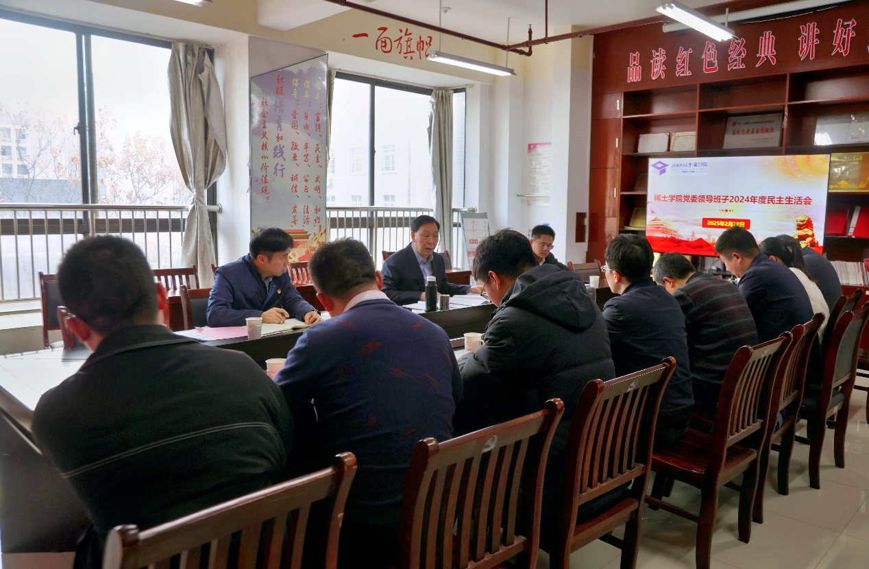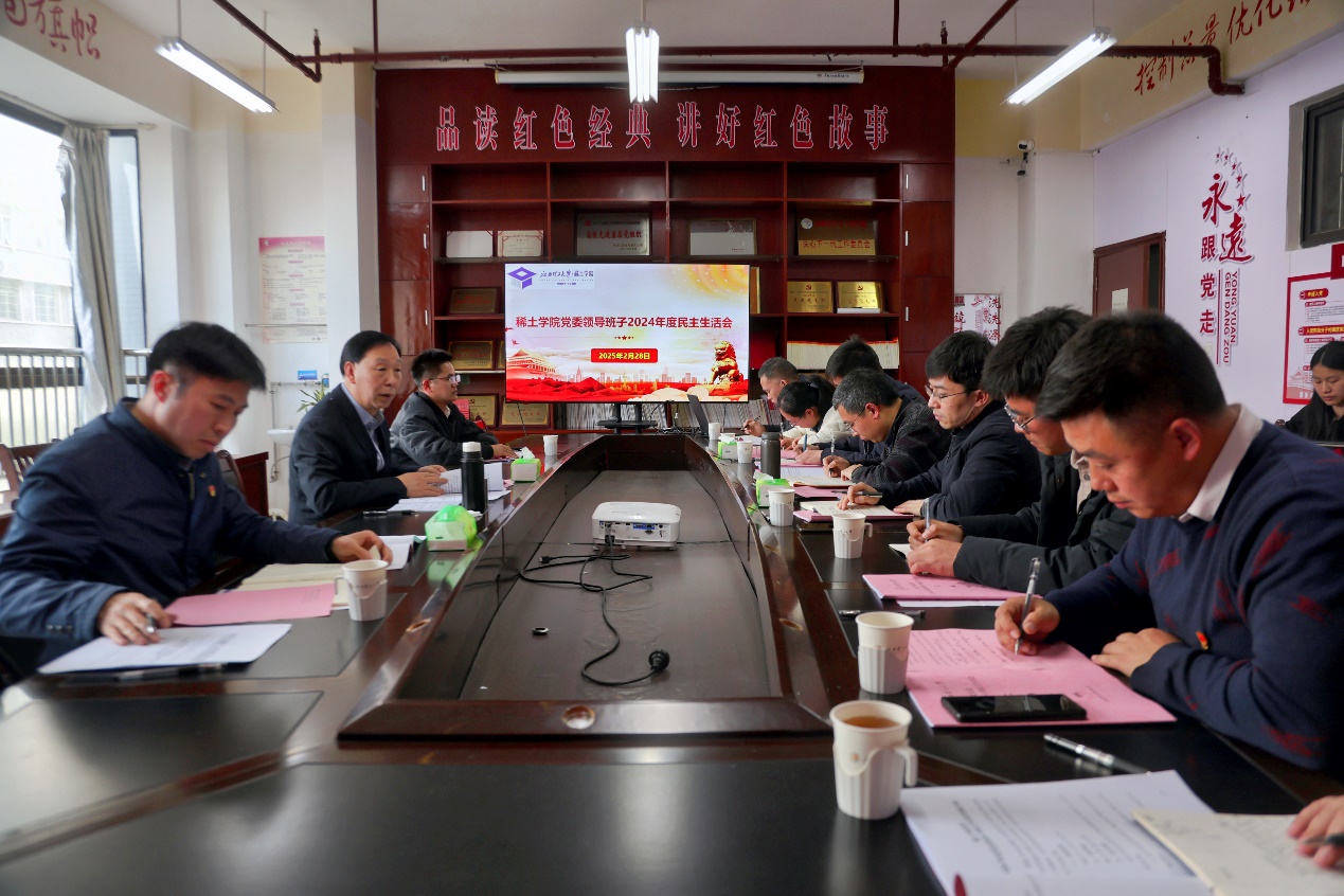 本网讯 2月28日下午,稀土学院2024年度党委领导班子民主生活会在稀土大楼C509会议室举行。校党委书记杨斌出席并讲话,相关职能部门负责人、稀土学院党委领导班子成员参加,稀土学院党委委员、党支部书记列席会议。