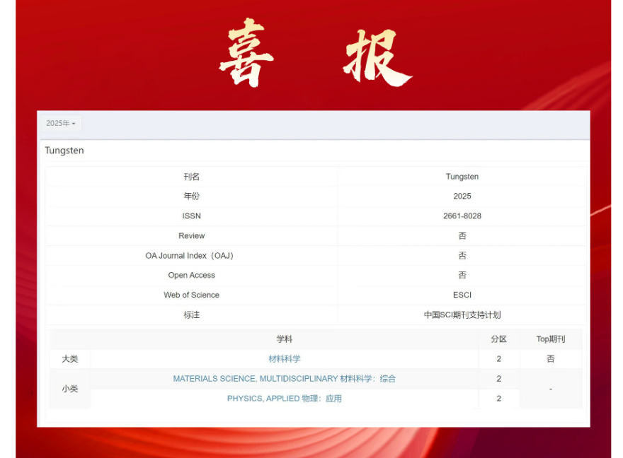 本网讯 近日,中国科学院文献情报中心正式发布《2025年中国科学院文献情报中心期刊分区表》。木瓜视频 主办《钨科技(英文)》(英文名:Tungsten)期刊成功入选中科院分区材料科学大类2区;材料科学:综合小类2区;物理:应用小类2区,标志着期刊在学术品牌和影响力上迈上了新的台阶,对促进科研成果的传播与交流将发挥更为深远的作用,也将为服务学校一流学科建设贡献更多力量。