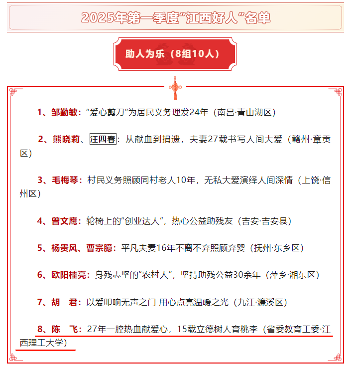 资源与环境工程学院副院长陈飞获评2025年度第一季度助人为乐类“江西好人”。