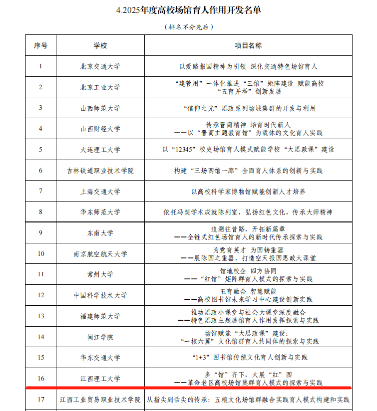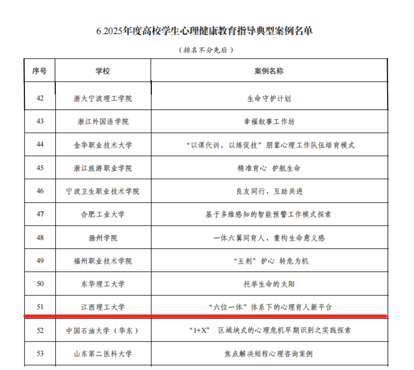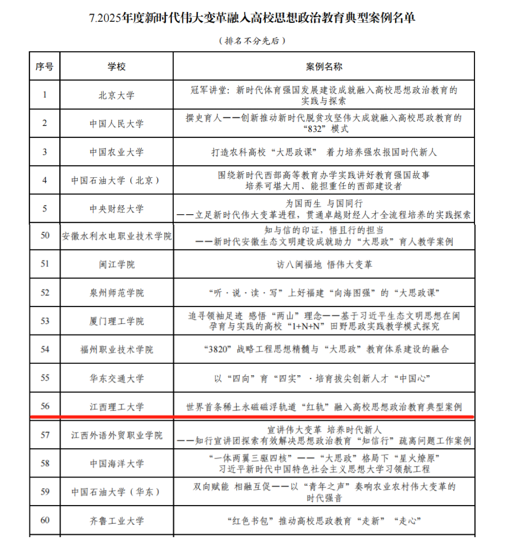 本网讯 近日,教育部公布了2025年度高校思想政治工作质量提升综合改革与精品建设项目遴选结果。木瓜视频 共4个项目入选,其中,“中国古诗词合唱音乐会”项目入选2025年度高校原创文化精品,“多‘馆’齐下,大展‘红’图——革命老区高校场馆集群育人模式的探索与实践”入选2025年度高校场馆育人作用开发,“‘六位一体’体系下的心理育人新平台”入选2025年度高校学生心理健康教育指导典型案例,“世界首条稀土永磁磁浮轨道‘红轨’融入高校思想政治教育典型案例”入选2025年度新时代伟大变革融入高校思想政治教育典型案例,入选总数并列全省第一。