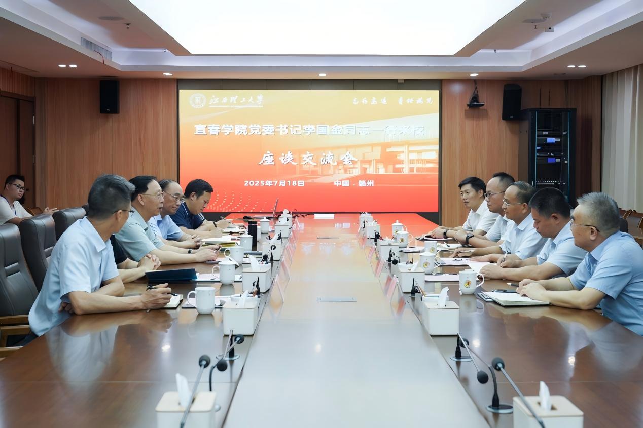 本网讯 7月18日下午,宜春学院党委书记李国金,党委副书记、校长蔡海生一行来访。校党委书记杨斌,中国工程院院士、校长葛世荣在三江校区濂溪楼2号会议室会见来宾并召开座谈交流会。会议由校党委常委、副校长董冰岩主持。
