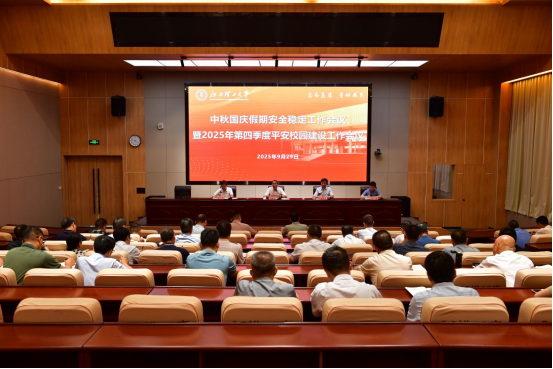 中秋国庆假期安全稳定工作会议暨2025年第四季度平安校园建设工作会议在三江校区(东园)启航会议厅召开。校党委书记刘祖文,校党委副书记徐志峰,校党委常委、纪委书记、监察专员刘飞,副校长汪航出席会议。学校相关职能部门主要负责人及各二级学院党委书记参加会议。会议由徐志峰主持。