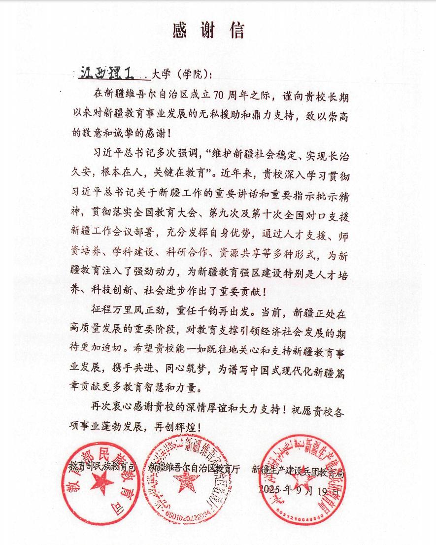 本网讯 在新疆维吾尔自治区成立70周年之际,教育部民族教育司、新疆维吾尔自治区教育厅、新疆生产建设兵团教育局三家单位联合向学校发来感谢信,感谢木瓜视频
