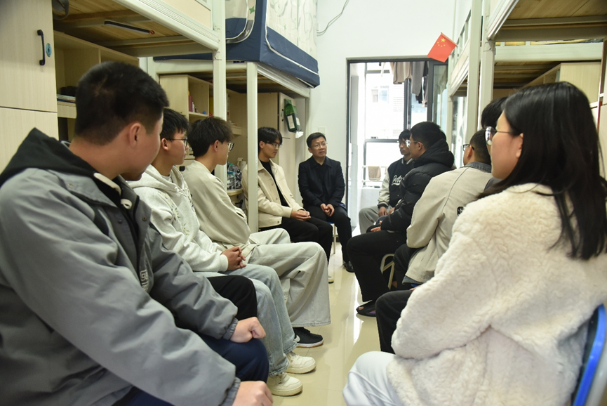 班会结束后,徐志峰来到学生宿舍开展寝室座谈。他走进寝室,自然地坐在同学们的凳子上,关切地询问:“宿舍热水供应正常吗?食堂的饭菜还习惯吗?新学期课程紧不紧?”一句句家常话,瞬间拉近了师生的距离。同学们也敞开心扉,真实反映日常问题,咨询考研与就业的选择。徐志峰一边倾听,一边对问题一一回应,表示学校会认真梳理、尽快解决。