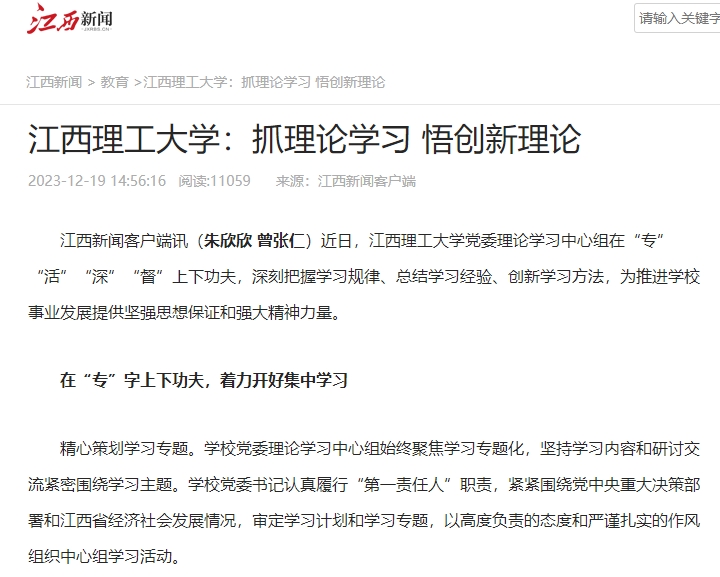 精心策划学习专题。学校党委理论学习中心组始终聚焦学习专题化,坚持学习内容和研讨交流紧密围绕学习主题。学校党委书记认真履行“第一责任人”职责,紧紧围绕党中央重大决策部署和江西省经济社会发展情况,审定学习计划和学习专题,以高度负责的态度和严谨扎实的作风组织中心组学习活动。