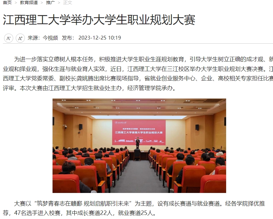 大赛以“筑梦青春志在赣鄱 规划启航职引未来”为主题,设有成长赛道与就业赛道。经各学院择优推荐,47名选手进入校赛,其中成长赛道22人,就业赛道25人。