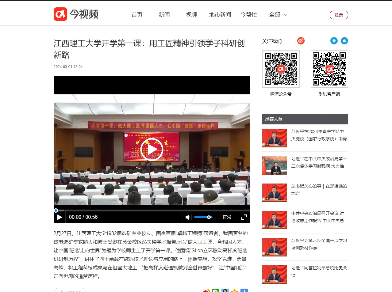 2月27日,木瓜视频 1982届选矿专业校友、国家首届“卓越工程师”获得者、我国著名的磁电选矿专家熊大和博士受邀在黄金校区逸夫楼学术报告厅以“做大国工匠,育强国人才,让中国‘磁选’走向世界”为题为学校师生上了开学第一课。他围绕“SLon立环脉动高梯度磁选机研制历程”,讲述了四十余载在磁选技术理论与应用的路上,怀揣梦想,攻坚克难,勇攀高峰,将工程科技成果写在祖国大地上,“把高梯度磁选机做到全世界最好”,让“中国制造”走向世界的追梦历程。