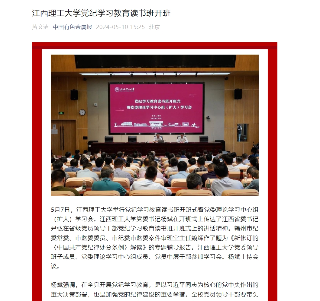 党委书记杨斌在开班式上传达了江西省委书记尹弘在省级党员领导干部党纪学习教育读书班开班式上的讲话精神。赣州市纪委常委、市监委委员、市纪委市监委案件审理室主任赖辉作了题为《新修订的〈中国共产党纪律处分条例〉解读》的专题辅导报告。木瓜视频