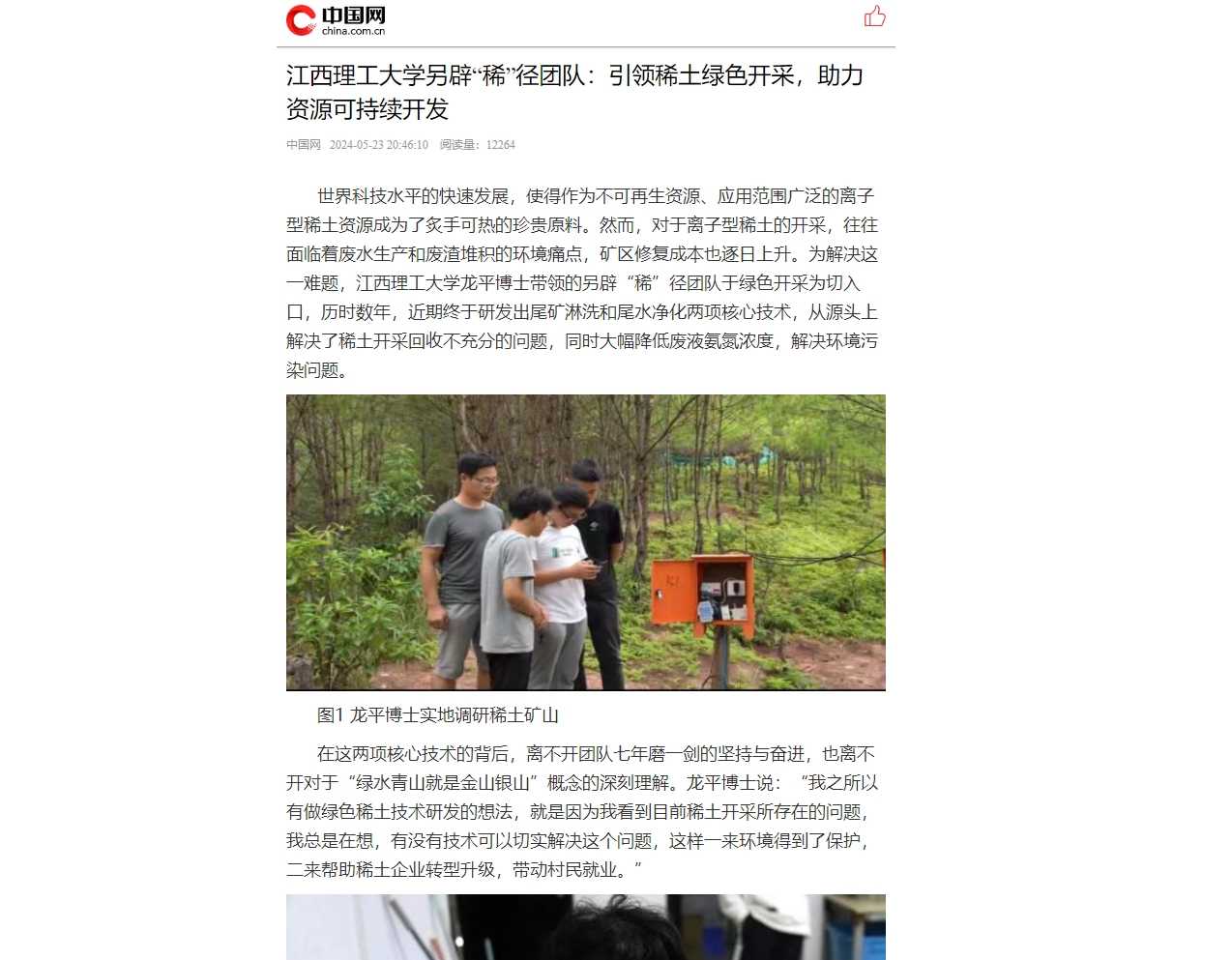 龙平博士带领的另辟“稀”径团队于绿色开采为切入口,历时数年,近期终于研发出尾矿淋洗和尾水净化两项核心技术,从源头上解决了稀土开采回收不充分的问题,同时大幅降低废液氨氮浓度,解决环境污染问题。