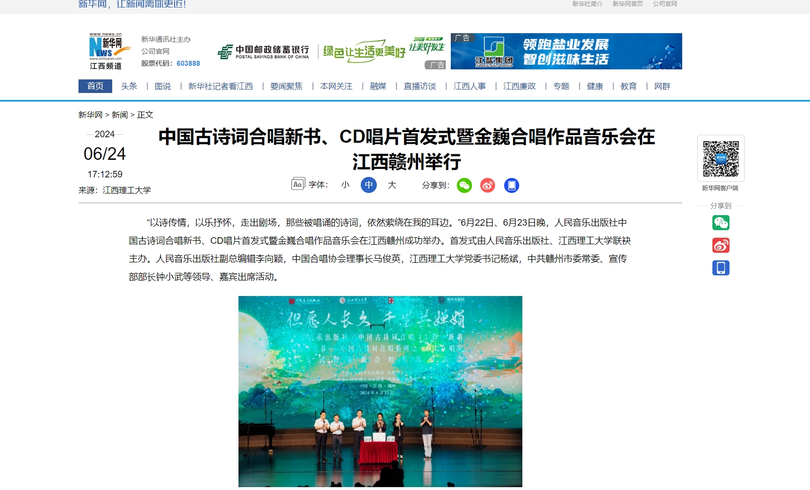 “以诗传情,以乐抒怀,走出剧场,那些被唱诵的诗词,依然萦绕在我的耳边。”6月22日、6月23日晚,人民音乐出版社中国古诗词合唱新书、CD唱片首发式暨金巍合唱作品音乐会在江西赣州成功举办。首发式由人民音乐出版社、木瓜视频