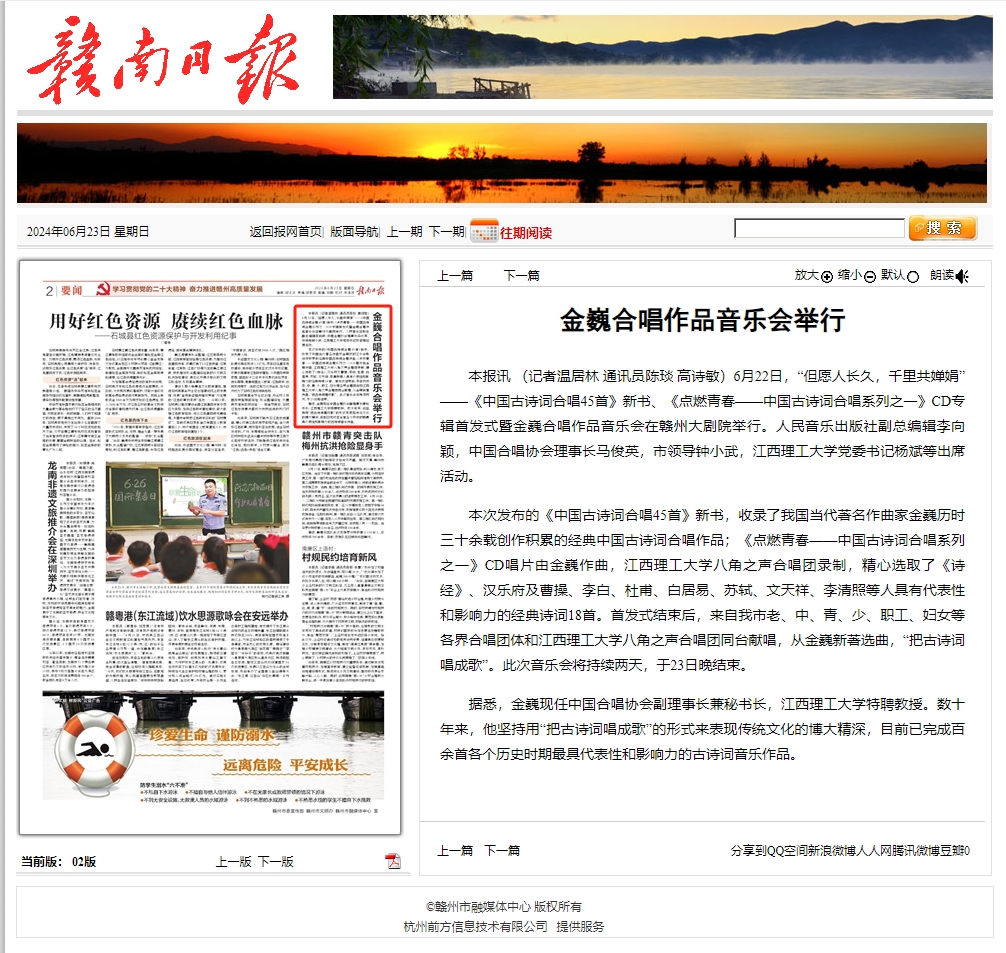 本报讯 (记者温居林 通讯员陈琰 高诗敏)6月22日,“但愿人长久,千里共婵娟”——《中国古诗词合唱45首》新书、《点燃青春——中国古诗词合唱系列之一》CD专辑首发式暨金巍合唱作品音乐会在赣州大剧院举行。人民音乐出版社副总编辑李向颖,中国合唱协会理事长马俊英,市领导钟小武,木瓜视频