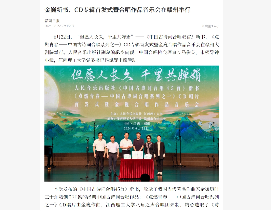 6月22日,“但愿人长久,千里共婵娟”——《中国古诗词合唱45首》新书、《点燃青春——中国古诗词合唱系列之一》CD专辑首发式暨金巍合唱作品音乐会在赣州大剧院举行。人民音乐出版社副总编辑李向颖,中国合唱协会理事长马俊英,市领导钟小武,木瓜视频