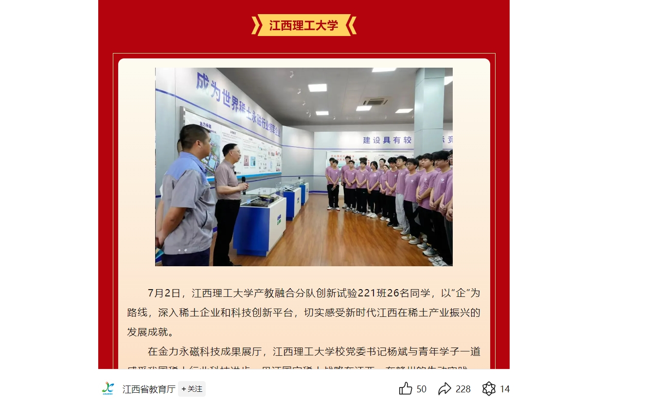 校党委书记杨斌与青年学子一道感受我国稀土行业科技进步,见证国家稀土战略在江西、在赣州的生动实践。