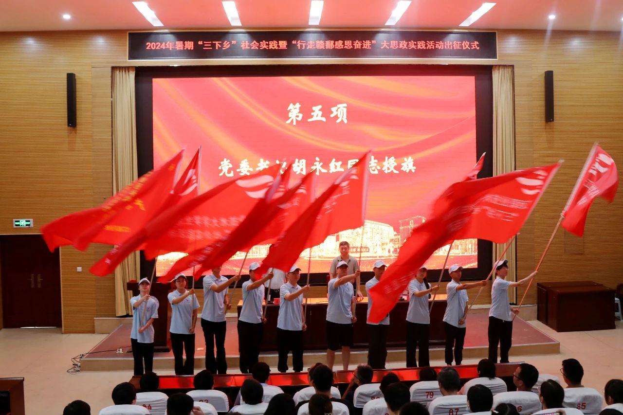 7月4日,赣南师范大学举行2024年大学生暑期社会实践暨大思政实践活动出征仪式。校党委副书记刘民为出征团队授旗并勉励师生要聚焦成果导向,开展有灵魂、有组织、有实效的社会实践。要充分发挥专业特长,多形式开展实践活动,在社会实践中找准人生目标,在国家需要中校准价值坐标,努力成为实干担当的“硬核青年”,在奋力谱写中国式现代化江西篇章中贡献青春力量、书写青春辉煌。