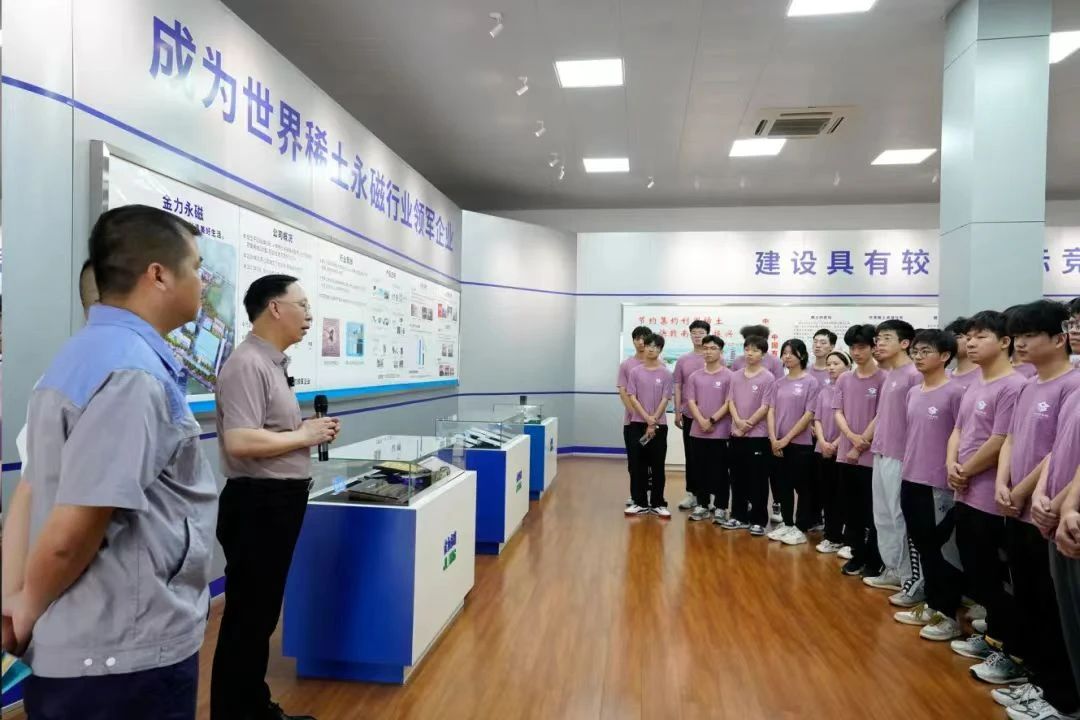 产教融合分队的学子们来到烧结炉车间、国家稀土功能材料创新中心,听金力永磁研发工程师详细讲解烧结运作模式、生产工艺流程和产研成果运用,并详细了解团队科研制备材料基本设备、科研项目孵化情况、稀土产业高质量发展举措等情况。