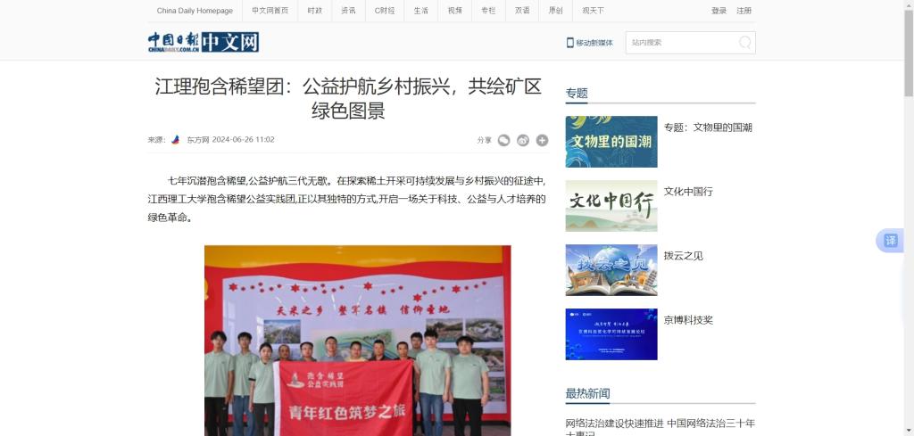 “坚持稀土资源绿色可持续发展是我们团队的宗旨。”指导教师董伟介绍道,正是在直面稀土开采所导致的环境悲剧——产业活动的停摆与水质的急剧恶化这一系列严峻后果之后,团队负责人宁周神毅然决定投入稀土废水净化的科研探索与公益帮扶,“孢”含“稀”望公益实践团应运而生。