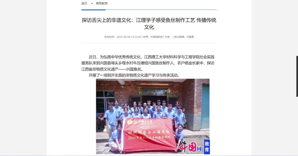 材料科学与工程学院社会实践服务队来到兴国县埠头乡程水村牛压塘组兴国鱼丝制作人、农户杨金长家中,探访江西省非物质文化遗产——兴国鱼丝。