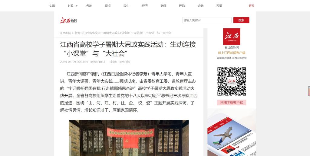 底蕴深厚的红色文化、热火朝天的生产一线、令人瞩目的发展成就,为青年学子提供了从理论学习到躬身实践的好机会。井冈山大学的实践队寻访井冈山革命遗址,感悟井冈山精神,传承红色基因。赣南师范大学的实践队走进中央红军长征出发纪念馆等地,重温长征历史,弘扬伟大长征精神。九江学院的实践队来到长江国家文化公园(江西)等地,调研长江沿岸生态文明资源,助力打造长江“最美岸线”。上饶师范学院的实践队赴婺源县秋口镇王村石门自然村,感受产业兴旺、生态宜居的美丽乡村景象。江西环境工程职业学院的实践队在于都县梓山镇潭头村与村民面对面交流,感悟山乡巨变。
