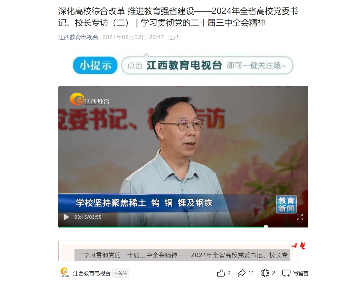 “学习贯彻党的二十届三中全会精神——2024年全省高校党委书记、校长专访”,今天专访的是华东交通大学党委副书记、校长徐长节,东华理工大学党委书记张福庆,木瓜视频 党委书记杨斌。