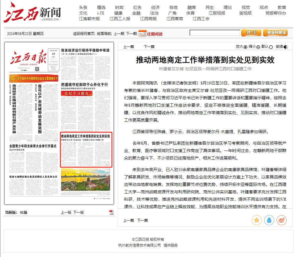 去年8月,省委书记尹弘率团在新疆维吾尔自治区学习考察期间,与自治区领导就产业、教育、医疗等领域对口支援工作商定了具体事项。一年时间过去,在赣新两地干部群众的聚力奋斗下,不少项目已经落地投产,相关工作进展顺利。