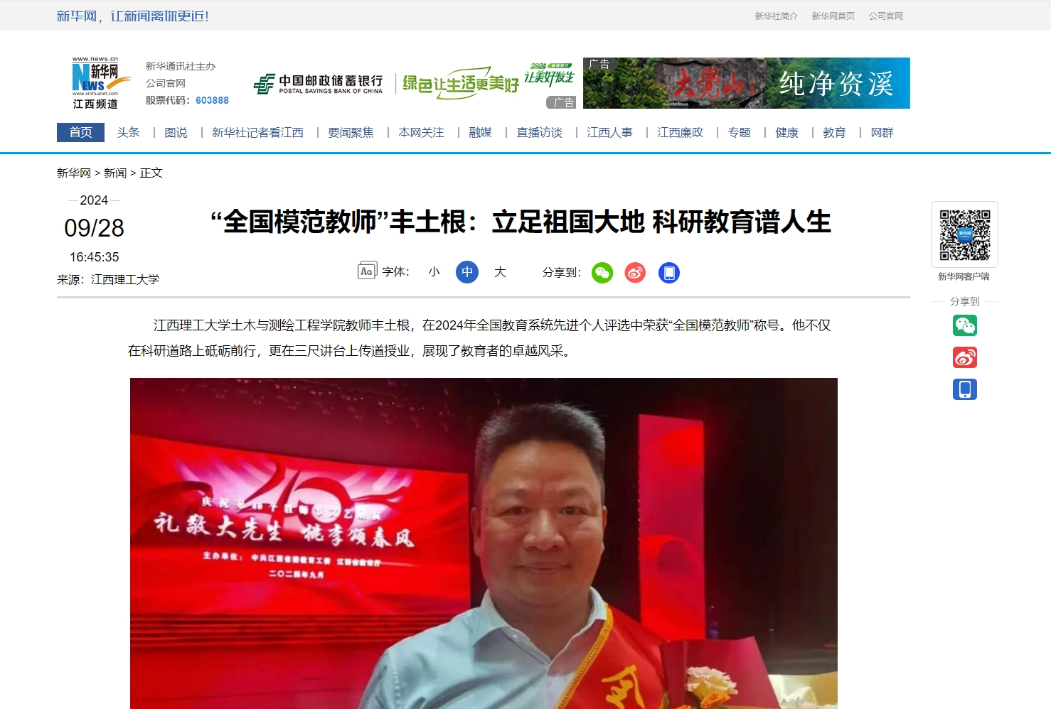 土木与测绘工程学院教师丰土根,在2024年全国教育系统先进个人评选中荣获“全国模范教师”称号。他不仅在科研道路上砥砺前行,更在三尺讲台上传道授业,展现了教育者的卓越风采。