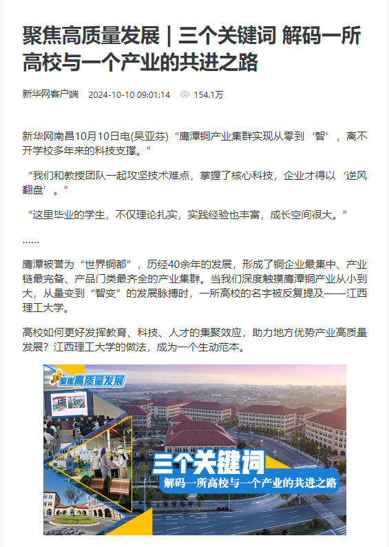 与鹰潭市人民政府、江西铜业集团等多方共建先进铜产业学院,催生出又一个国家级创新载体,将校地企三方合作向纵深推进了一步。
