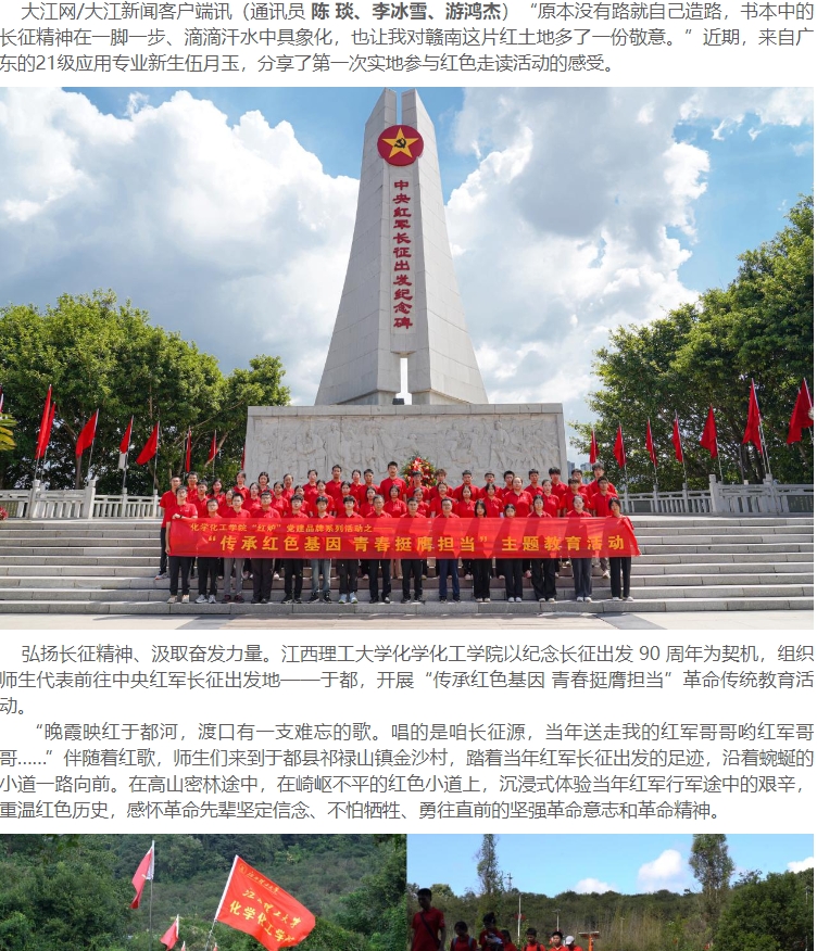 化学化工学院以纪念长征出发 90 周年为契机,组织师生代表前往中央红军长征出发地——于都,开展“传承红色基因 青春挺膺担当”革命传统教育活动。