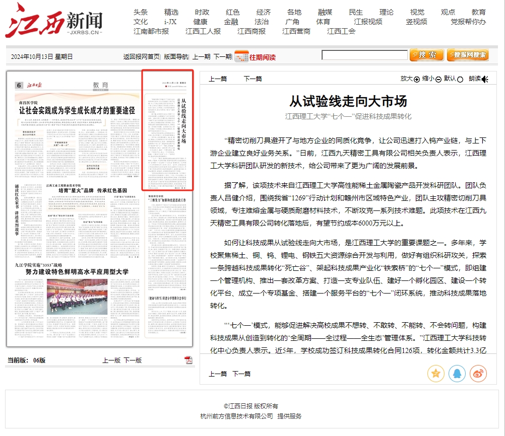 的重要课题之一。多年来,学校聚焦稀土、铜、钨、锂电、钢铁五大资源综合开发与利用,做好有组织科研攻关,探索一条跨越科技成果转化“死亡谷”、架起科技成果产业化“铁索桥”的“七个一”模式,即组建一个管理机构、推出一套改革方案、打造一支专业队伍、建好一个孵化园区、建设一个转化平台、成立一个专项基金、搭建一个服务平台的“七个一”闭环系统,推动科技成果落地转化。