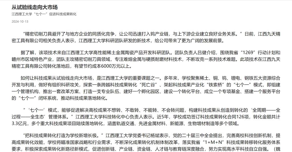 的重要课题之一。多年来,学校聚焦稀土、铜、钨、锂电、钢铁五大资源综合开发与利用,做好有组织科研攻关,探索一条跨越科技成果转化“死亡谷”、架起科技成果产业化“铁索桥”的“七个一”模式,即组建一个管理机构、推出一套改革方案、打造一支专业队伍、建好一个孵化园区、建设一个转化平台、成立一个专项基金、搭建一个服务平台的“七个一”闭环系统,推动科技成果落地转化。
