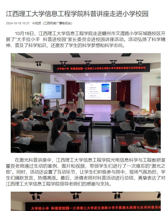 信息工程学院走进赣州市文清路小学环城路校区开展了“大手拉小手 科普进校园”家长委员会进校园讲座活动。活动弘扬了科学精神、普及了科学知识,还激发了学生的科学梦想和科学志向。