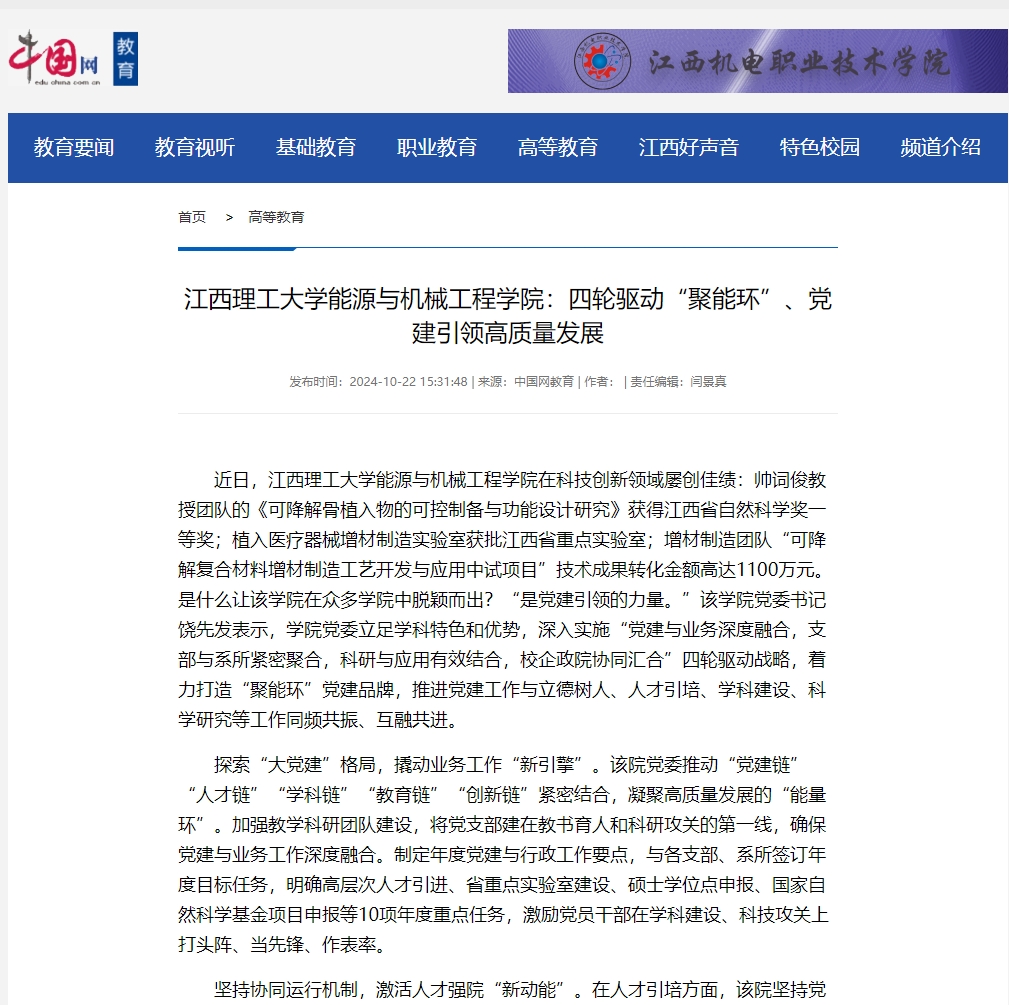 能源与机械工程学院在科技创新领域屡创佳绩:帅词俊教授团队的《可降解骨植入物的可控制备与功能设计研究》获得江西省自然科学奖一等奖;植入医疗器械增材制造实验室获批江西省重点实验室;增材制造团队“可降解复合材料增材制造工艺开发与应用中试项目”技术成果转化金额高达1100万元。是什么让该学院在众多学院中脱颖而出?“是党建引领的力量。”该学院党委书记饶先发表示,学院党委立足学科特色和优势,深入实施“党建与业务深度融合,支部与系所紧密聚合,科研与应用有效结合,校企政院协同汇合”四轮驱动战略,着力打造“聚能环”党建品牌,推进党建工作与立德树人、人才引培、学科建设、科学研究等工作同频共振、互融共进。