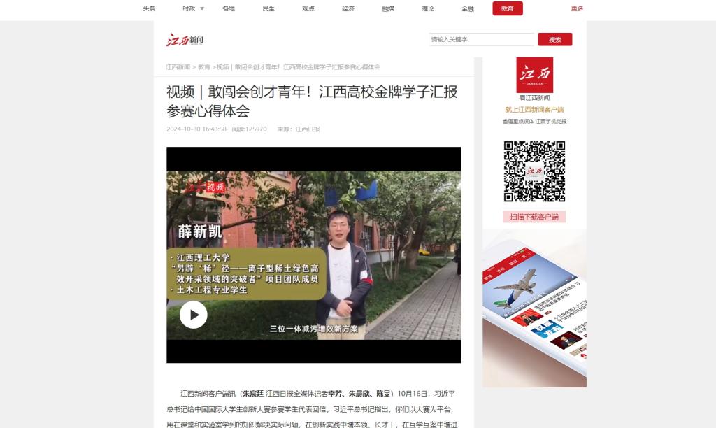江西新闻客户端讯(朱宸廷江西日报全媒体记者李芳、朱晨欣、陈旻)10月16日,习近平总书记给中国国际大学生创新大赛参赛学生代表回信。习近平总书记指出,你们以大赛为平台,用在课堂和实验室学到的知识解决实际问题,在创新实践中增本领、长才干,在互学互鉴中增进中外青年的友谊,这很有意义。在中国国际大学生创新大赛(2024)总决赛中,我省9所高校获得11项金奖,42项银奖,101项铜奖,奖牌总数位列全国前列。这些团队中,有的在科技最前沿展现青春作为,以创新服务国家战略;有的投向身边火热的经济社会各行各业,创新实践接“地气”……他们潜心钻研、突破创新、敢闯会创,为推动科技进步贡献青春力量、勇做新时代弄潮儿。连日来,记者走访了其中几个团队,一起来看看大学生们如何看待创新创业?
