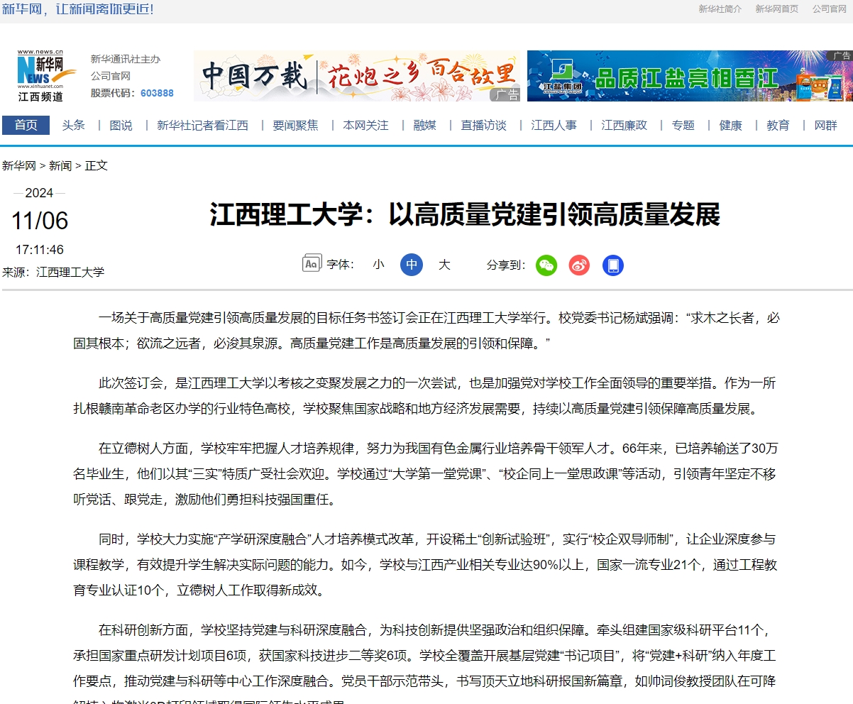 此外,学校还主动扛起社会责任,全力开拓合作共赢新局面。坚持“立足江西、面向全国,服务地方、服务行业”的办学定位,不断提升服务区域和行业发展核心竞争力。通过党建链推动教育链、产业链、创新链深度融合,与多地政府和企业签订党建联建协议,开展联建活动。先进铜产业学院等案例成为学校以党建为引领,服务地方经济社会高质量发展的生动实践。
