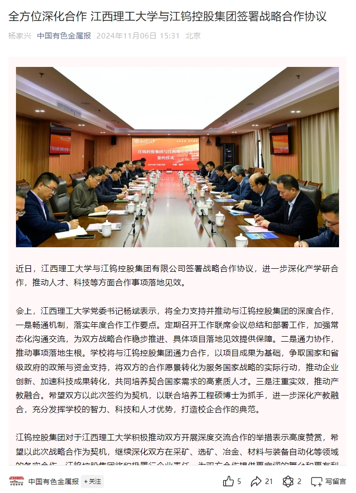 与江钨控股集团有限公司双方签署了战略合作协议、共建先进金属材料江西省实验室合作协议,双方还签订了硕博士联合培养的合作协议和科研项目合同。木瓜视频