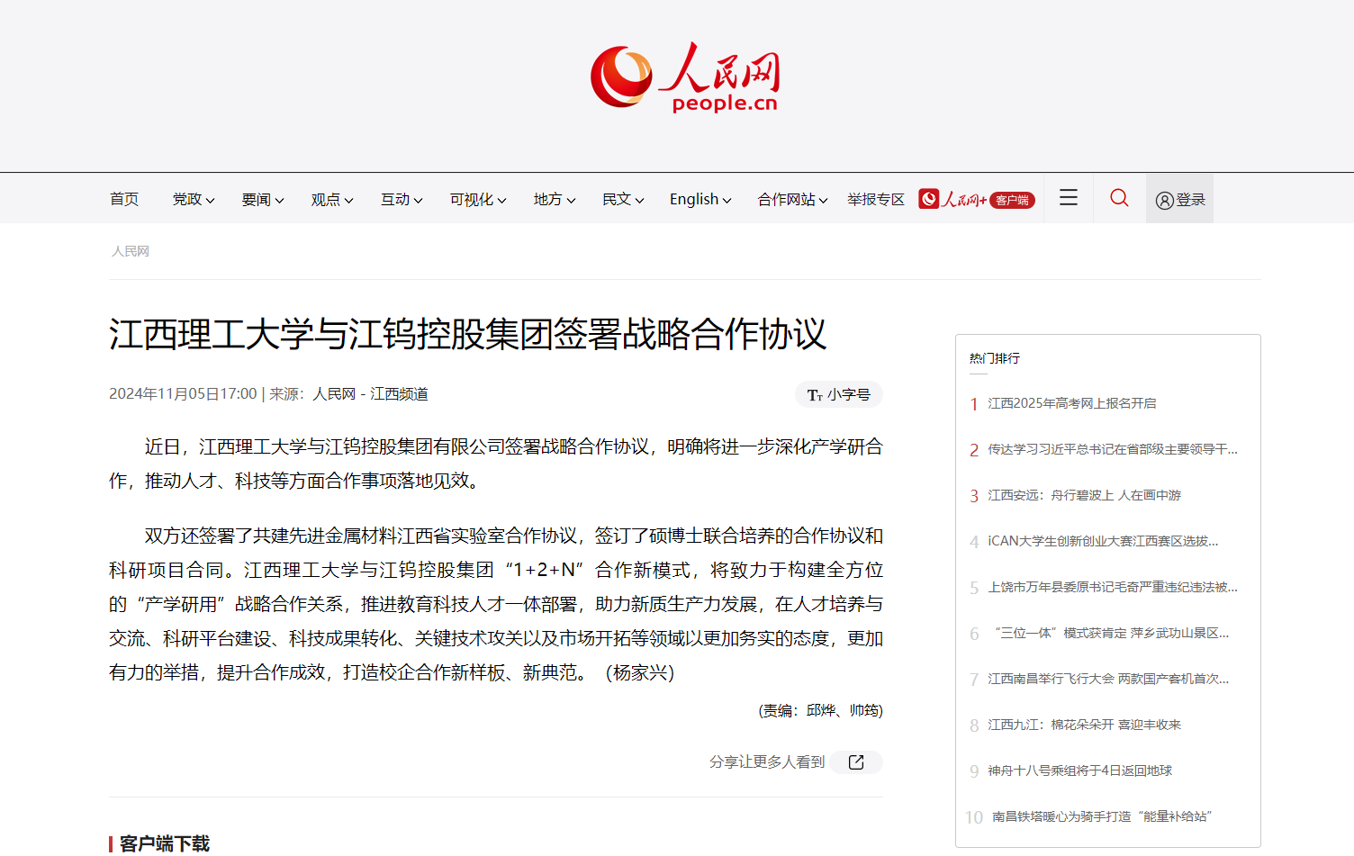 双方还签署了共建先进金属材料江西省实验室合作协议,签订了硕博士联合培养的合作协议和科研项目合同。木瓜视频 与江钨控股集团“1+2+N”合作新模式,将致力于构建全方位的“产学研用”战略合作关系,推进教育科技人才一体部署,助力新质生产力发展,在人才培养与交流、科研平台建设、科技成果转化、关键技术攻关以及市场开拓等领域以更加务实的态度,更加有力的举措,提升合作成效,打造校企合作新样板、新典范。