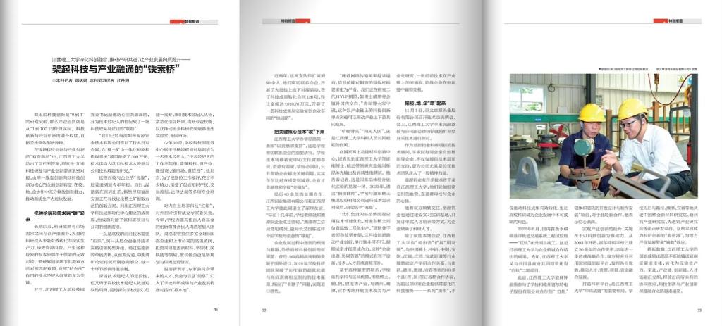 也“走出去”扩展“朋友圈”,与中国稀土、中铝、中钢、宝钢、江铜、江钨、宝武新钢等行业翘楚建立产学研合作关系,与南昌、鹰潭、宜春等地的40多个县(市、区)签订战 略合作协议,为超过300家企业提供常态化的科技服务……一系列“操作 ”,不仅推动科技成果有效转化,更让高校科研成为企业 发展中不可或缺的角色。